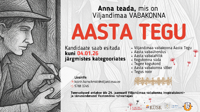 Kutsume vabaühendusi, asutusi, organisatsioone, ettevõtteid ja kohalikke omavalitsusi ning üksikisikuid esitama kandidaate Viljandimaa 2025. aasta parimate vabakonna tegijate tunnustamiskonkursile.
